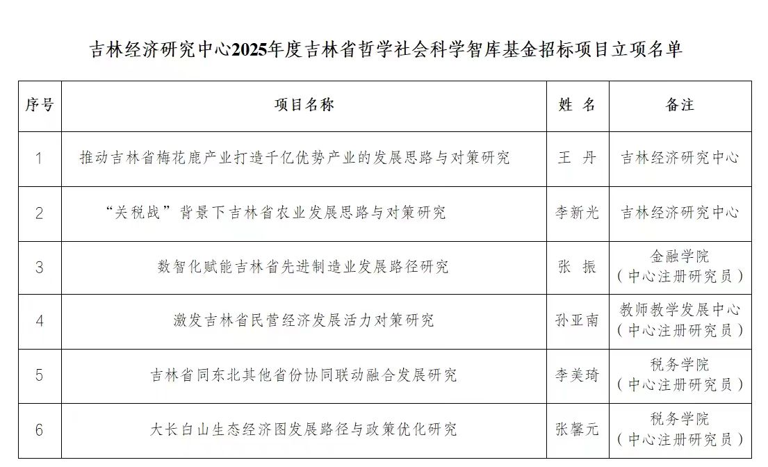 近日,吉林省社会科学界联合会公布了2025年度吉林省哲学社会科学智库基金招标项目立项名单,其中吉林经济研究中心研究员王丹、李新光、张振(注册研究员)、孙亚南(注册研究员)、李美琦(注册研究员)、张馨元(注册研究员)申报的项目成功立项,占全校立项总数的40%。